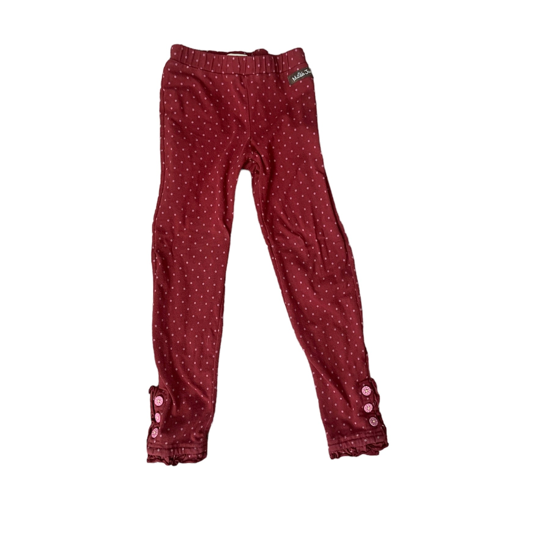 These maroon leggings feature pink dots. The hems have ruffles and buttons. These leggings are in good, pre-owned condition due to light wear.