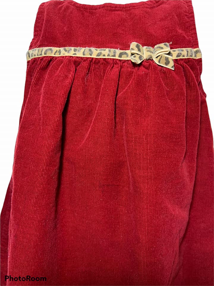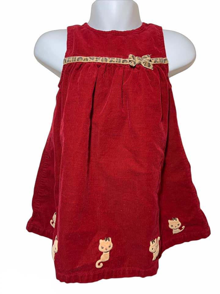 Red corduroy jumper with embroidered kitties around hem and velvet cheetah print ribbon on bodice