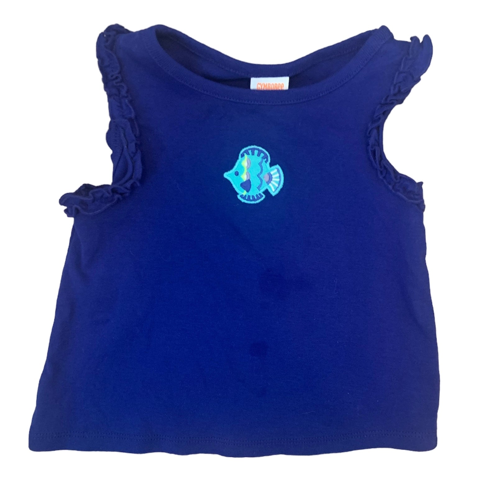 This is a dark blue tank with a teal fish. This tank is in *PLAY* condition for some spots on the front.