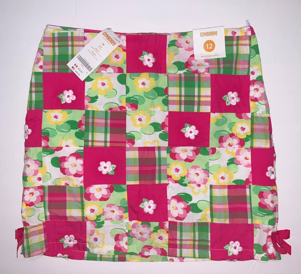 This skirt has a side zipper, built-in shorts, bows at the hem, and an adjustable waist. It has a patchwork design with embroidered flowers. This skort is new with tags.