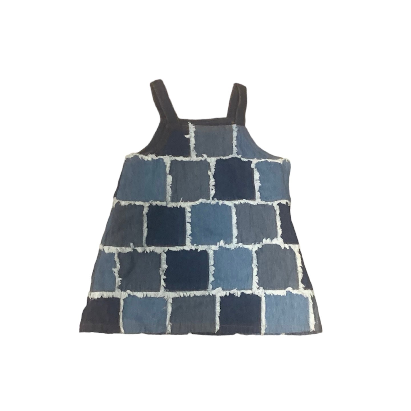 This is a cotton denim patched jumper with a side zipper. This dress is in like-new, pre-owned condition.