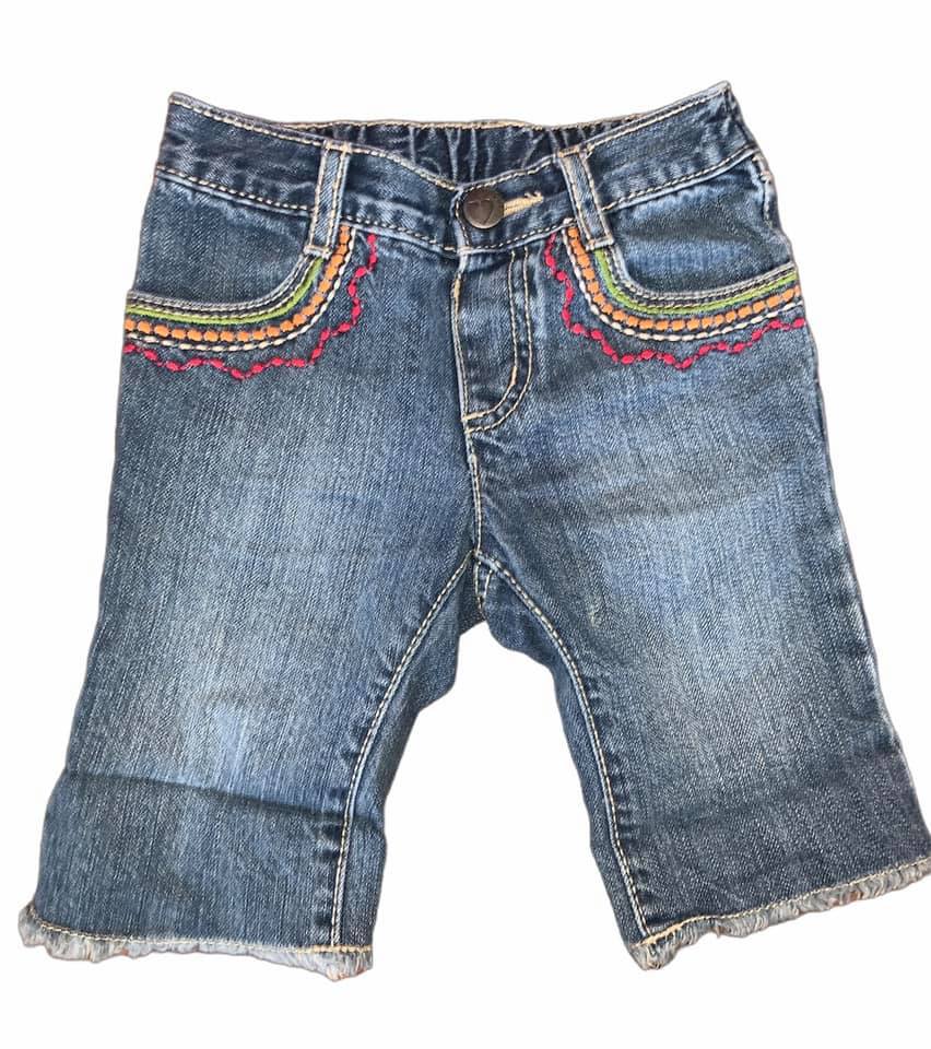 These denim cut-off capris feature embroidery around the front pockets. They are in *play* condition for a small mark on the back.