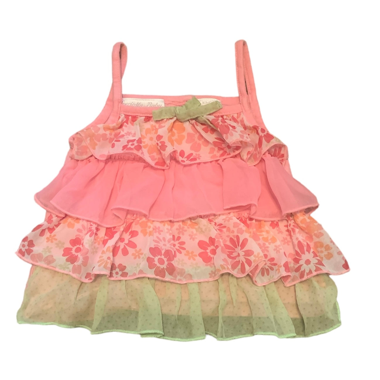 This pink, swing tank top features sheer tiers in green dot, pink, and floral. This is in good, pre-owned condition.