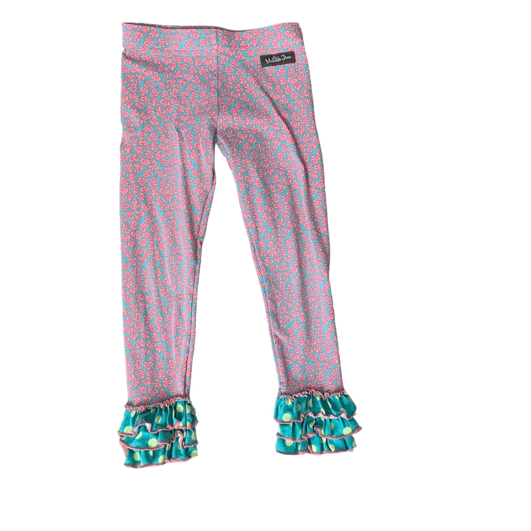 These mint-green leggings feature small, pink bows printed on the soft knit fabric. The hems have large ruffled layers with big polka-dots.These leggings are in like-new condition.