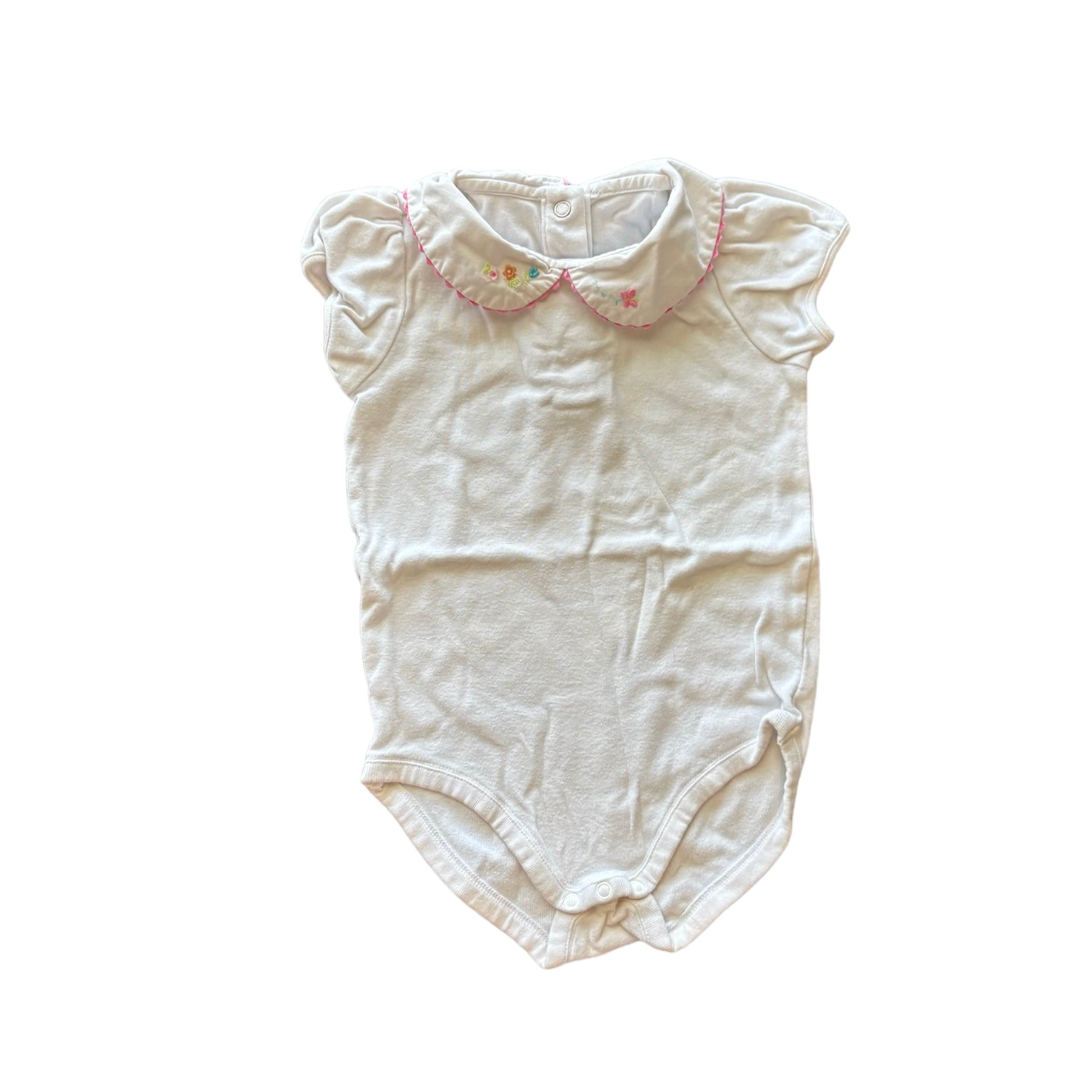 This white bodysuit snaps on the back and the bottom. The Peter Pan collar features embroidered flowers and ric rac trim. This bodysuit is in play condition due to a pinhole in the back and light stains on the front.