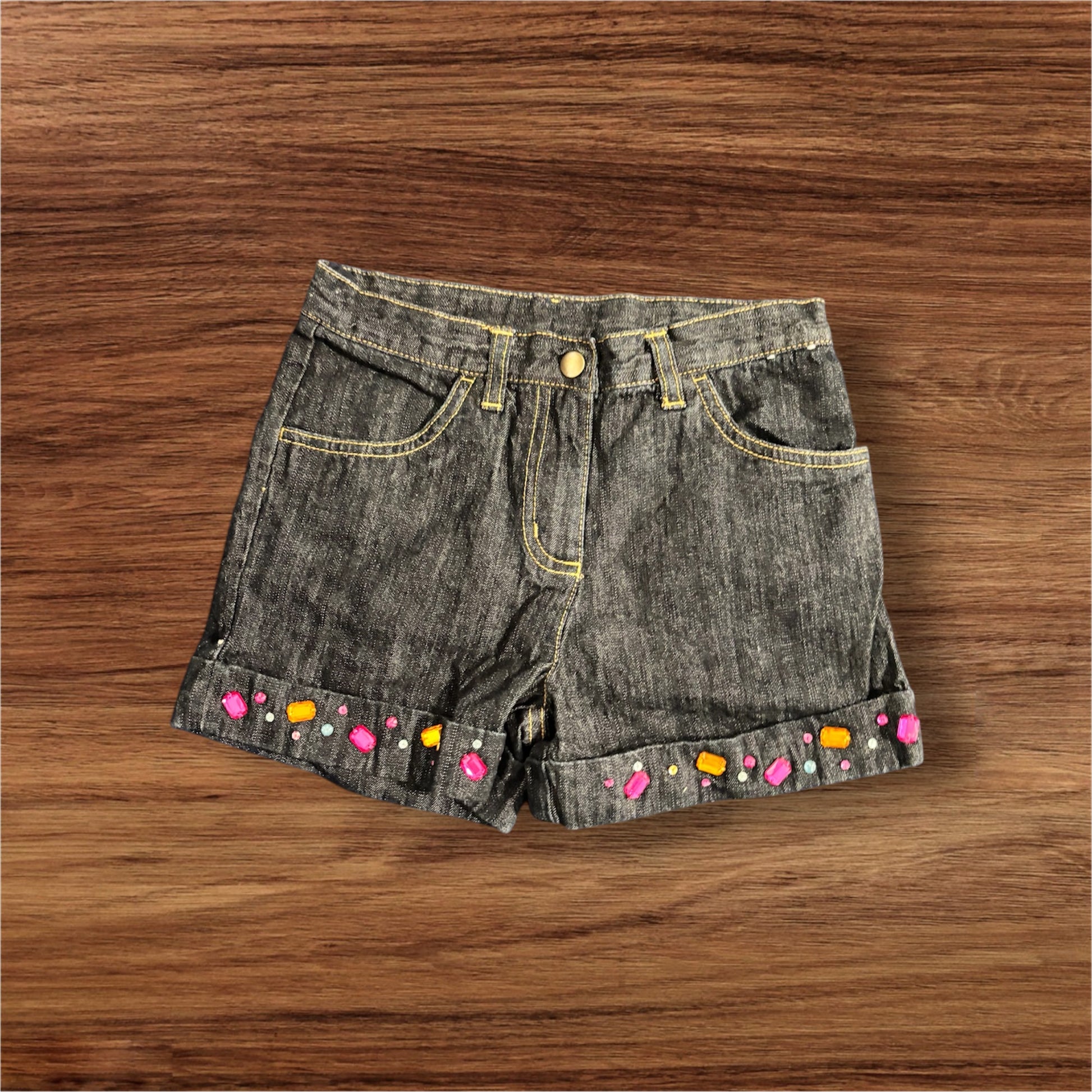 dark chambray cuff short with gems and adjustable waist