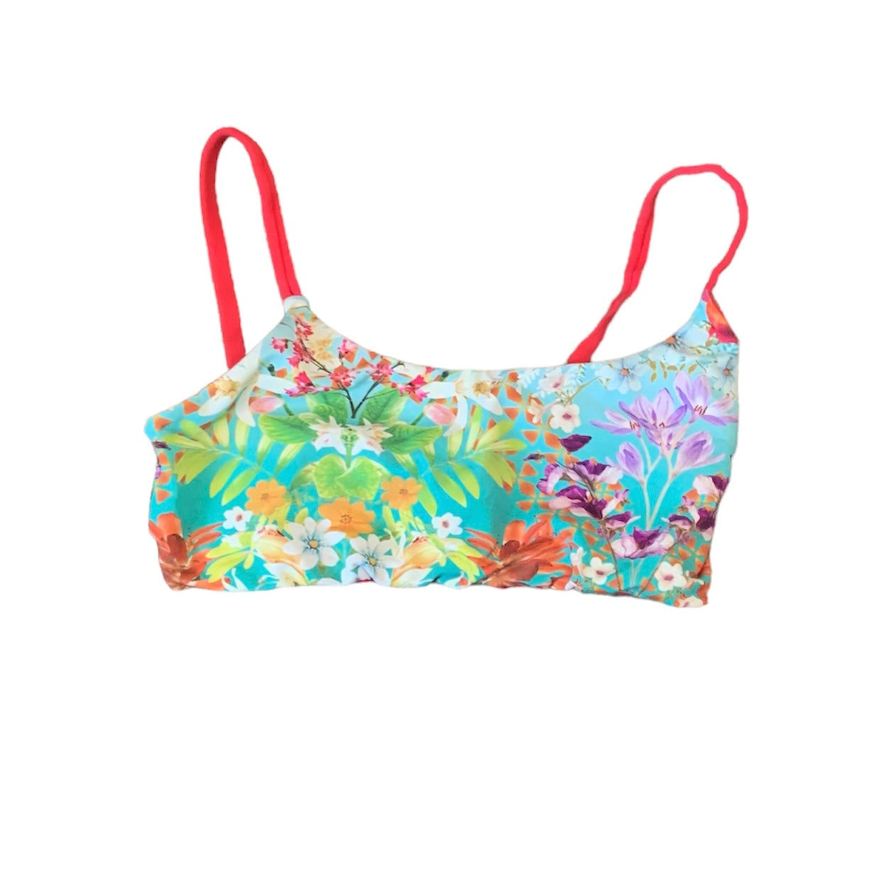 This bikini top features a tropical floral design on one side and a solid, light red on the reverse. It has cross straps in the back. This top is in like-new condition but tag is loose.